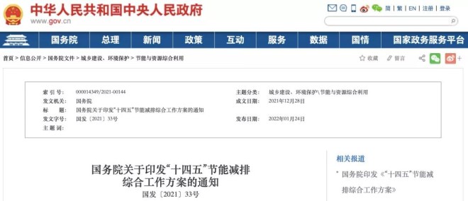 2022年1月24日,中華人民共和國中央人民政府網站發布了《國務院關于印發“十四五”節能減排綜合工作方案的通知》(以下簡稱“《通知》”)。