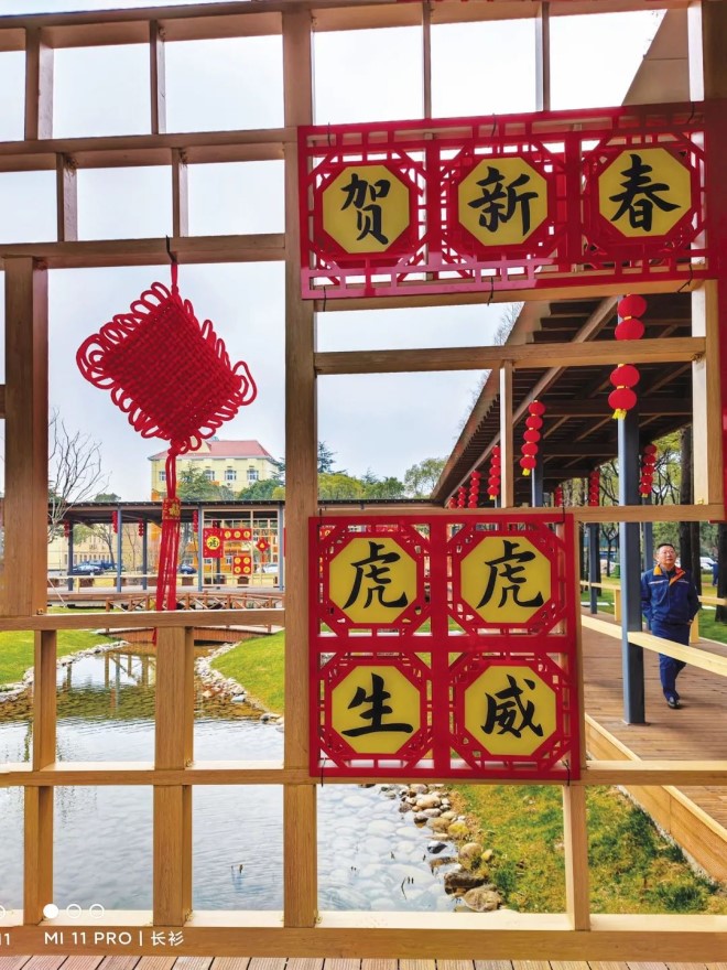 虎年臨近,中國寶武寶鋼股份寶山基地廠區內“閑趣荷苑”景觀被迎春的燈籠和福字“點亮”,新年的氣息撲面而來。(杜毅銘 攝)