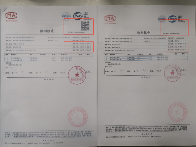 中碳能投科技(北京)有限公司篡改內(nèi)蒙古鄂爾多斯高新材料有限公司檢測報(bào)告(左圖為真實(shí)報(bào)告,右圖為篡改報(bào)告)