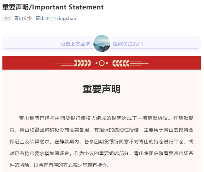 3月15日,從青山實業(yè)微信公眾號獲悉,青山集團已經(jīng)與由期貨銀行債權(quán)人組成的銀團達(dá)成了一項靜默協(xié)議。在靜默期內(nèi),青山和銀團將積極協(xié)商落實備用、有擔(dān)保的流動性授信,主要用于青山的鎳持倉保證金及結(jié)算需求。在靜默期內(nèi),各參團期貨銀行同意不對青山的持倉進(jìn)行平倉,或?qū)σ延谐謧}要求增加保證金。作為協(xié)議的重要組成部分,青山集團應(yīng)隨著異常市場條件的消除,以合理有序的方式減少其現(xiàn)有持倉。