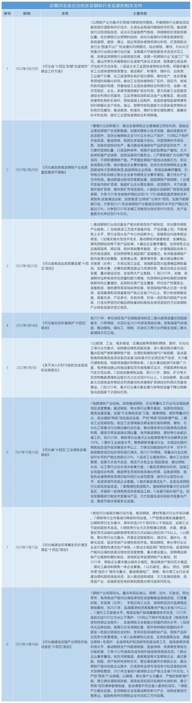 自2021年11月以來,河北省陸續出臺了8個與鋼鐵行業發展相關的文件(詳見下表),勾畫出河北省這一中國第一產鋼大省的鋼鐵行業發展藍圖。