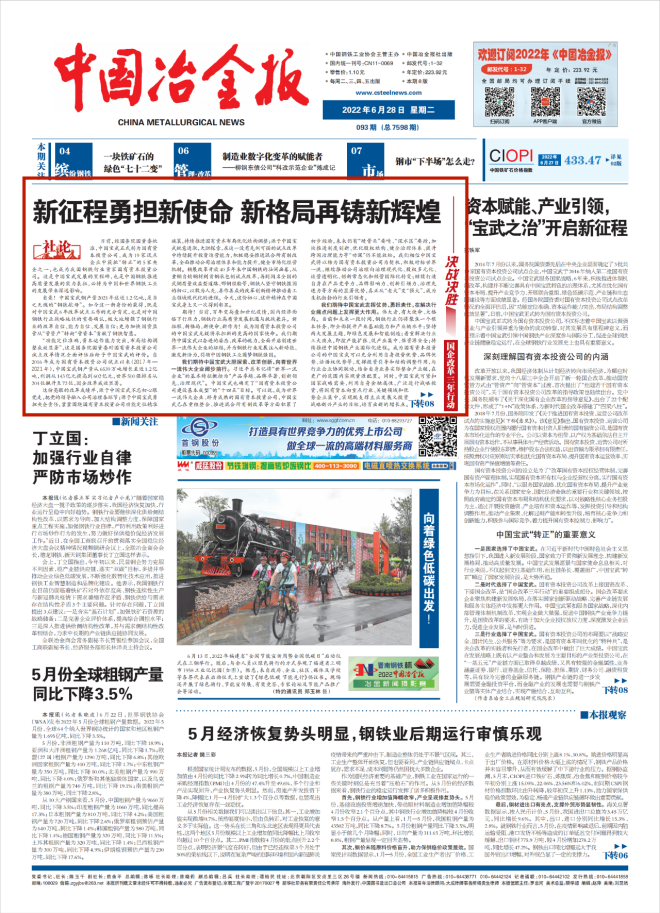 期待!當(dāng)前,百年變局疊加世紀(jì)疫情,國內(nèi)經(jīng)濟面臨下行壓力,鋼鐵行業(yè)高質(zhì)量發(fā)展機遇與挑戰(zhàn)兼具。新征程、新格局,新使命、新作為!成為國有資本投資公司的中國寶武無疑將承擔(dān)新的更高的國家使命。我們期待中國寶武以奮進的姿態(tài)、改革的魄力,全面開啟創(chuàng)建世界一流偉大企業(yè)的征程,并為鋼鐵行業(yè)發(fā)展注入新動能、激發(fā)新活力,引領(lǐng)中國鋼鐵工業(yè)圓夢鋼鐵強國。
