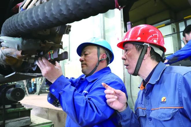 圖為艾愛國(右)在湘鋼勝利鋼管廠指導(dǎo)管道焊接工作。(湘鋼 供圖)