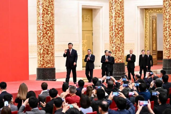 2022年10月23日12時許,人民大會堂金色大廳華燈璀璨,氣氛熱烈。中國共產黨第二十屆中央委員會總書記習近平和中央政治局常委李強、趙樂際、王滬寧、蔡奇、丁薛祥、李希步入大廳,同采訪黨的二十大的中外記者親切見面。