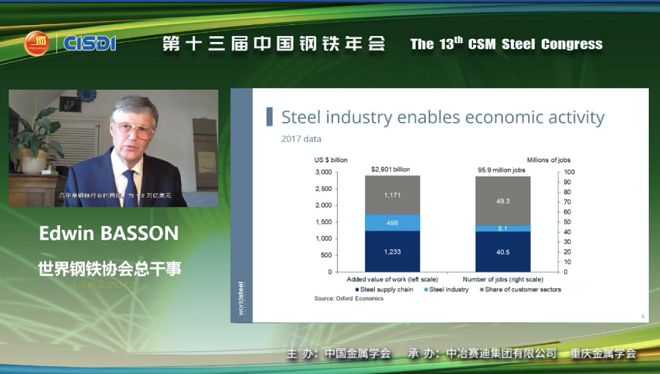 埃德溫·巴松以“未來可持續的鋼鐵工業”為主題做報告,指出鋼鐵行業面臨的挑戰是在鋼鐵產量繼續增長的同時減少二氧化碳排放。“做到這一點的唯一方法是降低二氧化碳強度。”巴松重點介紹了二氧化碳減排的三種路徑:一是效率路徑即“能效升級計劃”,即利用最佳實踐分享來嘗試和提高全球鋼鐵行業的效率;二是提升廢鋼資源的使用量;三是利用突破性技術降低二氧化碳強度,包括氫能的利用、CCUS(碳捕獲、利用與封存)等。其中,他特別強調了效率路徑的重要性:“如果我們有效使用鋼材并保持更長時間的使用,或者我們可以為鋼鐵找到第二次或第三次生命,這就意味著我們不需要制造新鋼材,也就節省了所有與二氧化碳減排相關的新鋼材的生產過程,這種鋼鐵生產效率和鋼鐵使用效率,是推動鋼鐵行業未來降低二樣化碳強度的重要杠桿。”