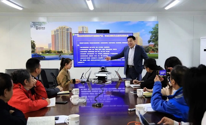 那么,鋼結構裝配式智能住宅是如何讓建筑更綠色、更智能、更宜居的?鋼鐵產業和建筑產業下一步該如何協同發展、共筑美好家園?帶著這樣的期許,11月12日,中國鋼鐵工業協會副秘書長,中國冶金報社黨委書記、社長陳玉千和總編輯陳琢帶領中國冶金報社報道組一行8人深入國子郡二期項目現場調研,并專訪了該項目主要推動人——中國房地產業協會智能建造委員會執行主任兼秘書長、北京建誼集團董事長、銫鐠科技有限公司創始人張鳴。
