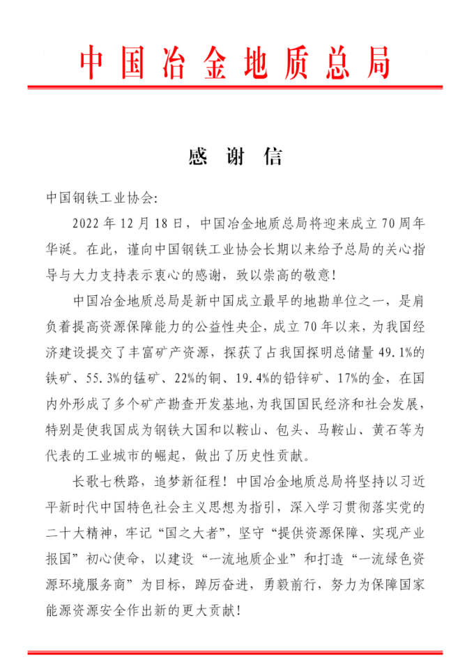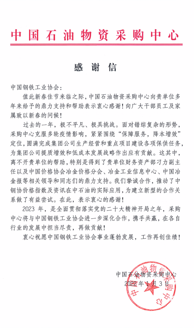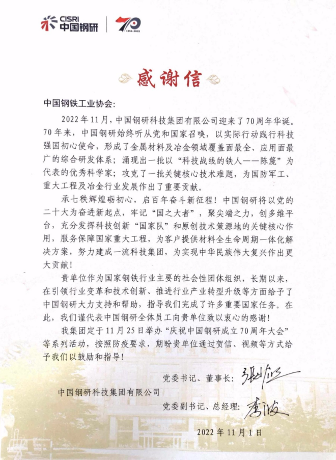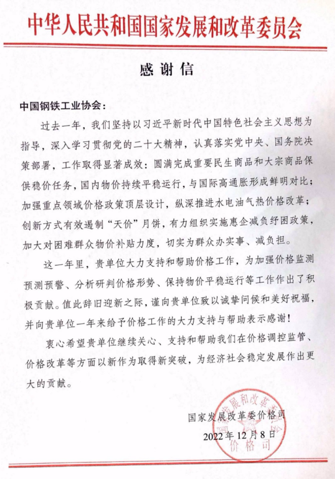 律回春漸,時盛歲新。2022年,國家發展改革委、工信部、國資委管理局、河鋼集團、中國鋼研、鄭州商品交易所、中國冶金地質總局、中國石油物資采購中心等向中國鋼鐵工業協會發來感謝信,對鋼協在積極配合支持相關工作開展、凝聚行業發展共識、引領行業變革和技術創新、促進行業綠色低碳發展等方面發揮的作用給予高度評價,對鋼協提供的大力支持表示誠摯感謝。