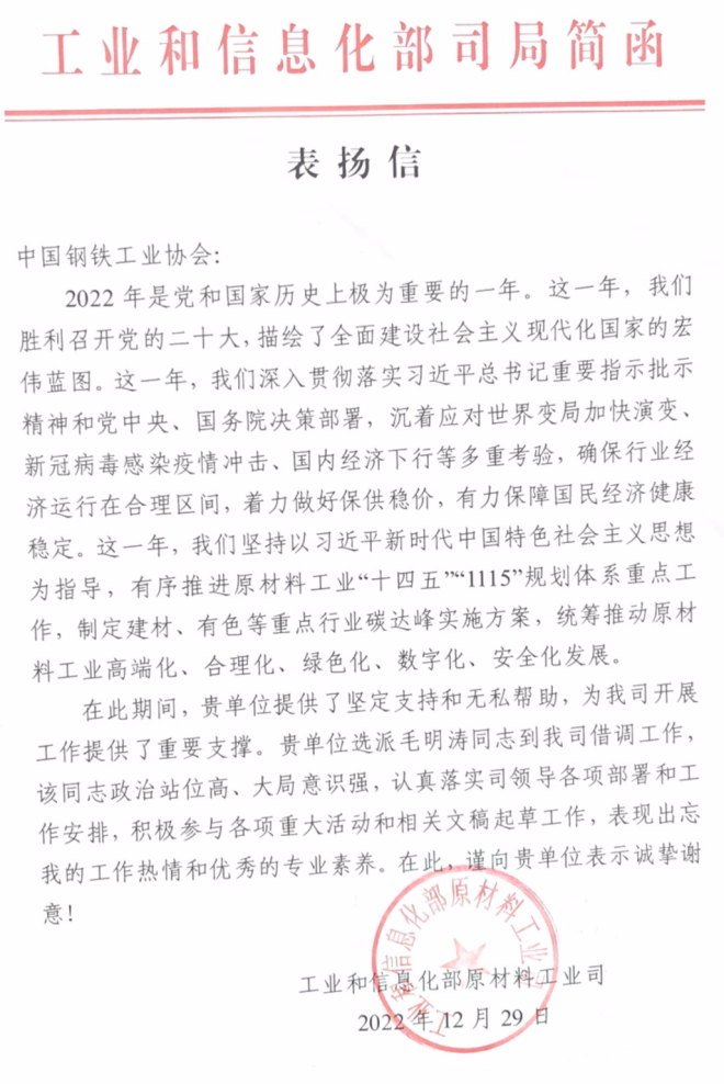 國家發展改革委、工信部、國資委、河鋼、中國鋼研等向鋼協發來感謝信