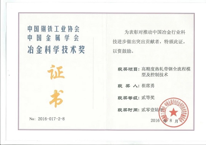 高精度熱軋帶鋼全流程模型及控制技術獲冶金科學技術獎二等獎