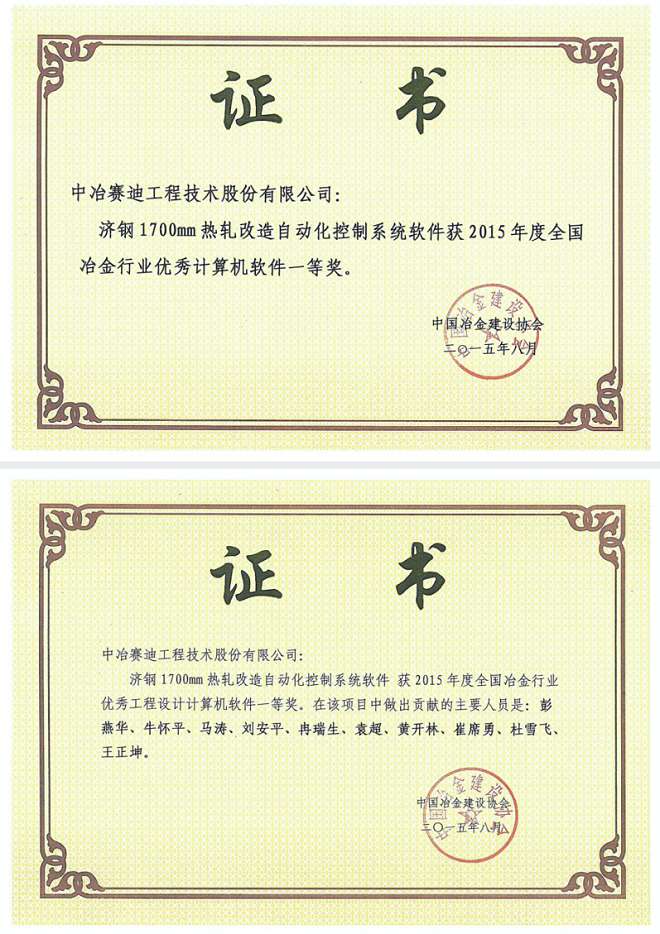 濟鋼1700mm熱軋改造自動化控制系統軟件獲2015年全國冶金行業優秀工程設計計算機軟件一等獎