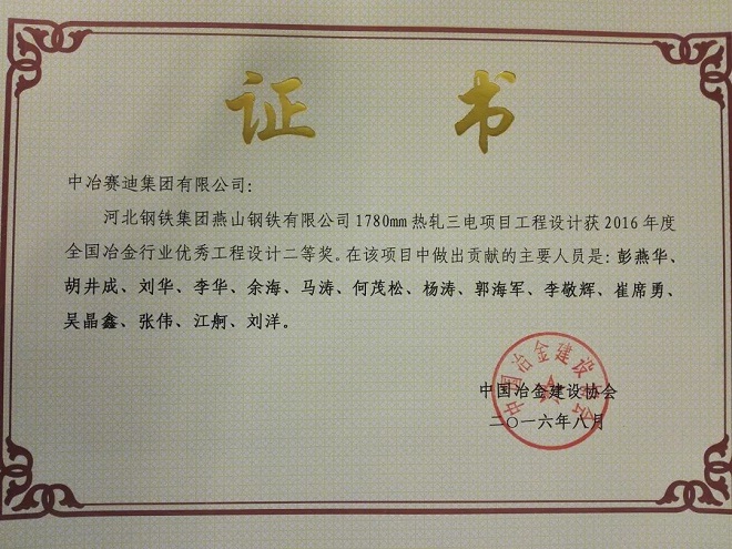 河北鋼鐵集團燕山鋼鐵有限公司1780mm熱軋三電項目工程設計獲2016年度全國冶金行業優秀工程設計二等獎