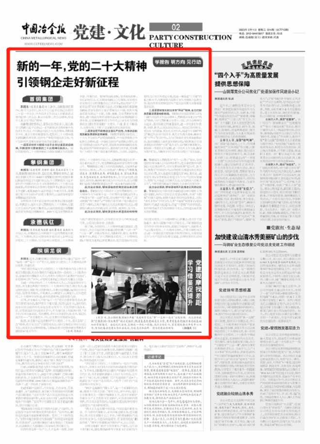 1月份以來,承德釩鈦公司積極學(xué)習(xí)宣傳貫徹落實(shí)黨的二十大精神,該公司領(lǐng)導(dǎo)班子成員深入各單位宣講黨的二十大精神,號(hào)召各單位將黨的二十大精神與提產(chǎn)增效緊密結(jié)合,引導(dǎo)黨員在學(xué)習(xí)中吹響奮進(jìn)號(hào)角,立足崗位做表率、創(chuàng)佳績。