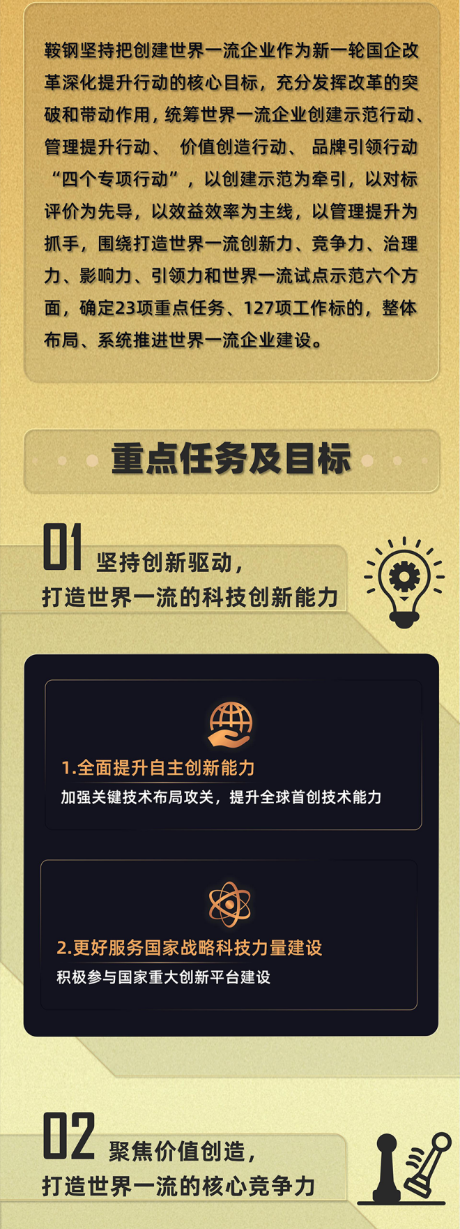 《安排》指出,鞍鋼集團堅持把創(chuàng)建世界一流企業(yè)作為新一輪國企改革深化提升行動的核心目標,充分發(fā)揮改革的突破和帶動作用,統(tǒng)籌世界一流企業(yè)創(chuàng)建示范行動、管理提升行動、價值創(chuàng)造行動、品牌引領行動“四個專項行動”,以創(chuàng)建示范為牽引、以對標評價為先導、以效益效率為主線、以管理提升為抓手,圍繞打造世界一流創(chuàng)新力、競爭力、治理力、影響力、引領力和世界一流試點示范6個方面確定23項重點任務。
