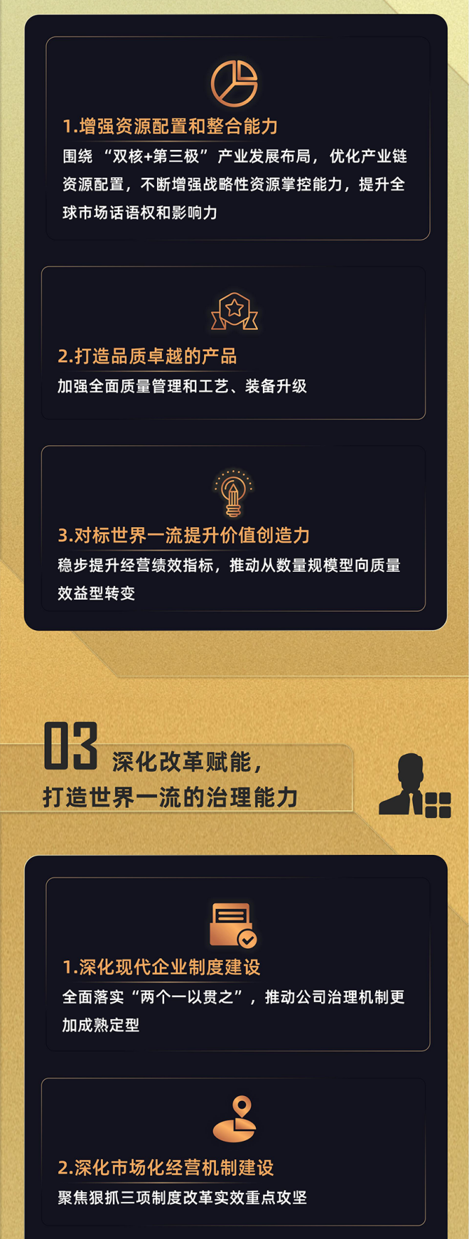 ——聚焦價值創(chuàng)造,打造世界一流的核心競爭力。增強資源配置和整合能力,圍繞“雙核+第三極”產(chǎn)業(yè)發(fā)展布局,優(yōu)化產(chǎn)業(yè)鏈資源配置,不斷增強戰(zhàn)略性資源掌控能力,提升全球市場話語權和影響力;打造品質(zhì)卓越的產(chǎn)品,加強全面質(zhì)量管理和推進工藝、裝備升級;對標世界一流提升價值創(chuàng)造力,穩(wěn)步提升經(jīng)營績效指標,推動從數(shù)量規(guī)模型向質(zhì)量效益型轉(zhuǎn)變。