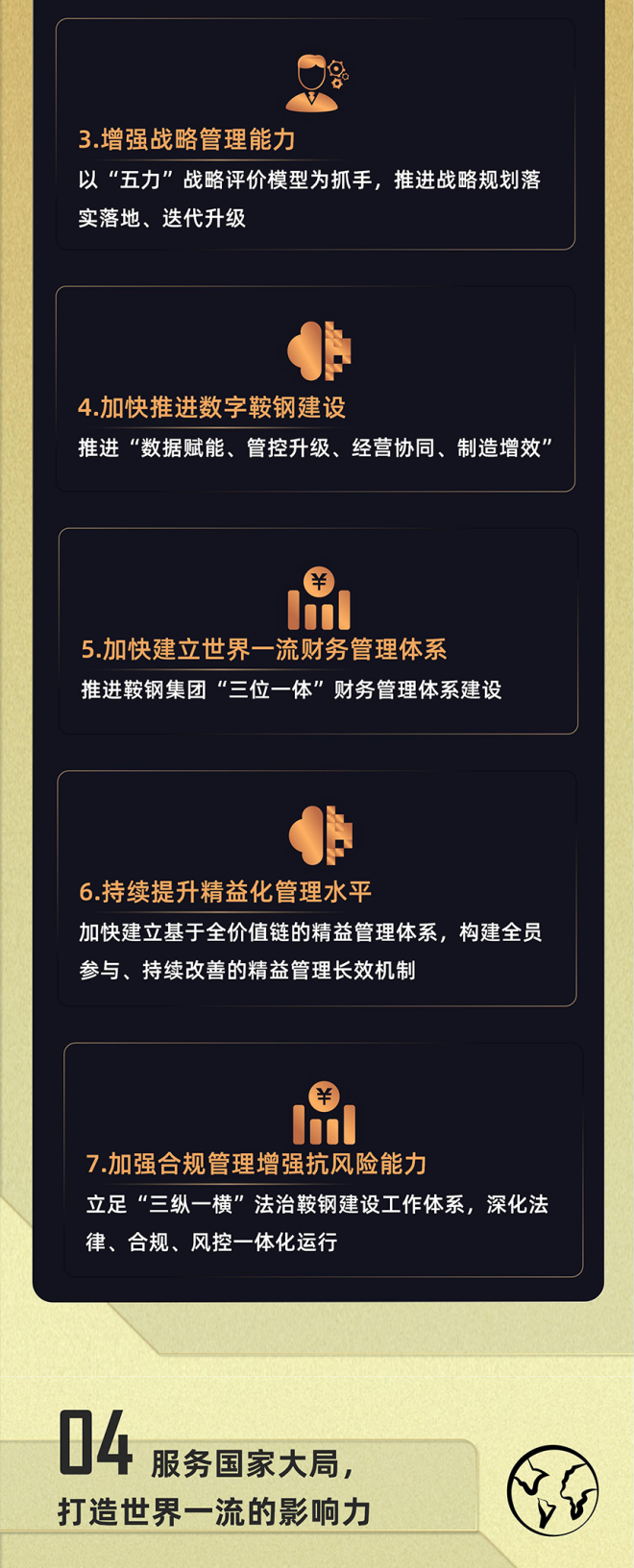 ——深化改革賦能,打造世界一流的治理能力。深化現(xiàn)代企業(yè)制度建設,全面落實“兩個一以貫之”,推動公司治理機制更加成熟定型;深化市場化經(jīng)營機制建設,聚焦狠抓三項制度改革實效重點攻堅;增強戰(zhàn)略管理能力,以“五力”戰(zhàn)略評價模型為抓手,推進戰(zhàn)略規(guī)劃落實落地、迭代升級;加快推進數(shù)字鞍鋼建設,推進“數(shù)據(jù)賦能、管控升級、經(jīng)營協(xié)同、制造增效”;加快建立世界一流財務管理體系,推進鞍鋼集團“三位一體”財務管理體系建設;加快建立基于全價值鏈的精益管理體系,構建全員參與、持續(xù)改善的精益管理長效機制;加強合規(guī)管理,增強抗風險能力,立足“三縱一橫”法治鞍鋼建設工作體系,深化法律、合規(guī)、風控一體化運行。