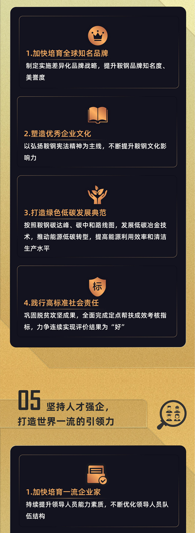 ——服務國家大局,打造世界一流的影響力。加快培育全球知名品牌,制定實施差異化品牌戰(zhàn)略,提升鞍鋼品牌知名度、美譽度;塑造優(yōu)秀企業(yè)文化,以弘揚“鞍鋼憲法”精神為主線,不斷提升鞍鋼文化影響力;打造綠色低碳發(fā)展典范,按照鞍鋼集團碳達峰、碳中和路線圖,發(fā)展低碳冶金技術,推動能源低碳轉(zhuǎn)型,提高能源利用效率和清潔生產(chǎn)水平;踐行高標準社會責任,鞏固脫貧攻堅成果,全面完成定點幫扶成效考核指標,力爭連續(xù)實現(xiàn)評價結果為“好”。