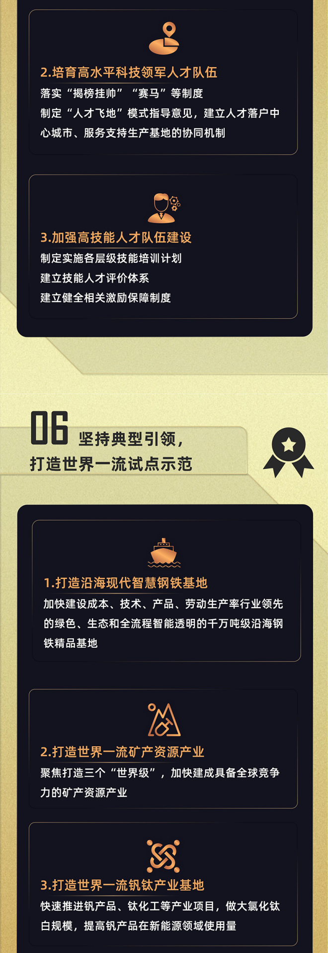 ——堅持典型引領,打造世界一流試點示范。打造沿海現(xiàn)代智慧鋼鐵基地,加快建設成本、技術、產(chǎn)品、勞動生產(chǎn)率行業(yè)領先的綠色、生態(tài)和全流程智能透明的千萬噸級沿海鋼鐵精品基地;打造世界一流礦產(chǎn)資源產(chǎn)業(yè),聚焦打造三個“世界級”,加快建成具備全球競爭力的礦產(chǎn)資源產(chǎn)業(yè);打造世界一流釩鈦產(chǎn)業(yè)基地,快速推進釩產(chǎn)品、鈦化工等產(chǎn)業(yè)項目,做大氯化鈦白規(guī)模,提高釩產(chǎn)品在新能源領域使用量;打造現(xiàn)代治理示范,聚焦三個“新樣板”建設,打造先進治理模式。