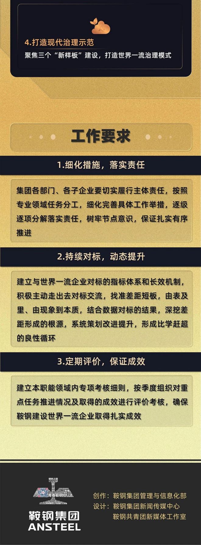 《安排》要求,鞍鋼集團各部門、各子企業(yè)要切實履行主體責任,按照專業(yè)領域任務分工,細化完善具體工作舉措,逐級逐項分解落實責任,樹牢節(jié)點意識,保證扎實有序推進;建立與世界一流企業(yè)對標的指標體系和長效機制,積極主動走出去對標交流,找準差距短板,由表及里、由現(xiàn)象到本質(zhì),結合數(shù)據(jù)對標結果,深挖差距形成根源,系統(tǒng)策劃改進提升,形成“比學趕超”的良性循環(huán);建立本職能領域內(nèi)專項考核細則,按季度組織對重點任務推進情況及取得的成效進行評價考核,確保鞍鋼集團建設世界一流企業(yè)取得扎實成效。
