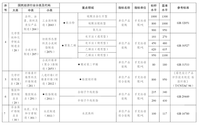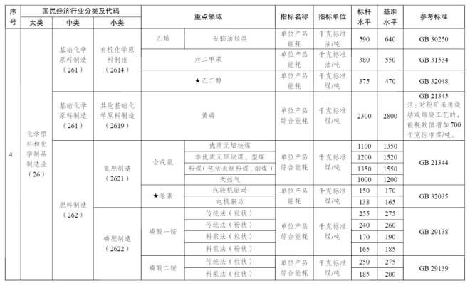 結合工業重點領域產品能耗、規模體量、技術現狀和改造潛力等,進一步拓展能效約束領域。在此前明確煉油、煤制焦炭、煤制甲醇、煤制烯烴、煤制乙二醇、燒堿、純堿、電石、乙烯、對二甲苯、黃磷、合成氨、磷酸一銨、磷酸二銨、水泥熟料、平板玻璃、建筑陶瓷、衛生陶瓷、煉鐵、煉鋼、鐵合金冶煉、銅冶煉、鉛冶煉、鋅冶煉、電解鋁等25個重點領域能效標桿水平和基準水平的基礎上,增加乙二醇,尿素,鈦白粉,聚氯乙烯,精對苯二甲酸,子午線輪胎,工業硅,衛生紙原紙、紙巾原紙,棉、化纖及混紡機織物,針織物、紗線,粘膠短纖維等11個領域,進一步擴大工業重點領域節能降碳改造升級范圍。