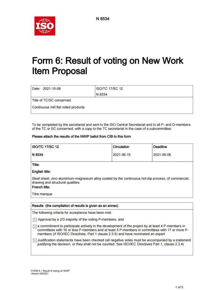 2021年10月8日,酒鋼聯(lián)合冶金工業(yè)信息標(biāo)準(zhǔn)研究院提出的ISO國際標(biāo)準(zhǔn)《商品級、沖壓級和結(jié)構(gòu)級用連續(xù)熱浸鍍鋅鋁鎂合金鍍層鋼板及鋼帶》新工作項目提案成功立項,2022年5月18日,該國際標(biāo)準(zhǔn)國內(nèi)工作組成立暨第一次會議召開,酒鋼作為成員單位參加會議。此項目是我國加入ISO/TC17/SC12分技術(shù)委員會20年來成功立項的第一個國際標(biāo)準(zhǔn)制定項目。這標(biāo)志著我國參與鋼板鋼帶領(lǐng)域國際標(biāo)準(zhǔn)制定工作取得了重大突破,不僅將填補(bǔ)鋅鋁鎂產(chǎn)品的國際標(biāo)準(zhǔn)空白,還可進(jìn)一步提升酒鋼集團(tuán)在相關(guān)產(chǎn)品領(lǐng)域的國際影響力。