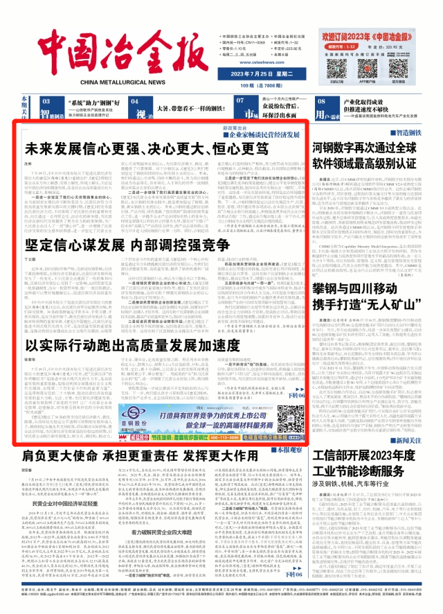 二是進一步增強了我們高質量發展實業的決心。《意見》為民營企業未來發展指明“高質量發展”的方向路徑,在沙鋼的具體實踐中,就是更加堅定了做精、做強、做實鋼鐵主業的信心。未來,沙鋼將通過抓好創新引領、產品升級、綠色低碳、“智改數轉”及國際拓展等重點工作,進一步提升企業產品在國際市場上的競爭力,特別是要強化以科技自立自強為先導,強化對“卡脖子”技術和“高精尖”產品的攻關研發,使產品品質和核心競爭力早日進入國際鋼鐵行業第一方陣。同時,沙鋼還將重點精心打造特鋼生產板塊,努力使其成為在國際、國內規模最大、品種最全、檔次最高,具有國際品牌影響力和競爭力的特鋼生產企業。