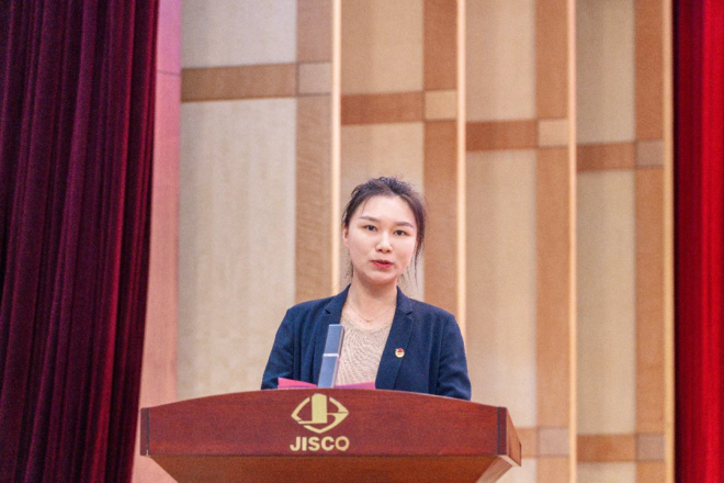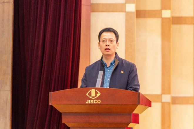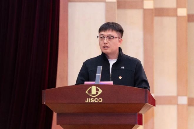 圖為金占雄作題為《聚焦企業戰略目標,創新人才工作機制,用青年力量“火種”點燃酒鋼高質量發展“引擎”》的主旨報告
