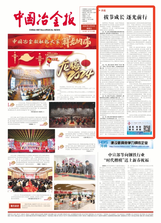 癸卯辭舊,甲辰迎新。這是《中國(guó)冶金報(bào)》與您的第7919次見(jiàn)面,也是我們?cè)诠锩甑淖詈笠淮我?jiàn)面。祝您新春快樂(lè)。