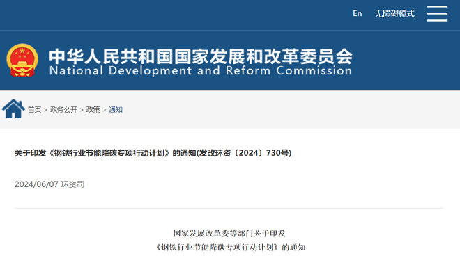 6月7日,國家發展改革委發布了關于印發《鋼鐵行業節能降碳專項行動計劃》的通知。