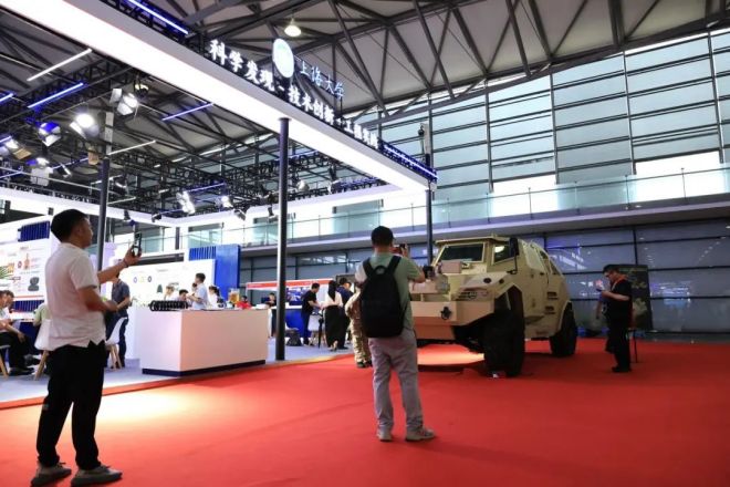 圖為上海大學展臺展出的特種鋼車輛吸引了參觀者紛紛駐足拍照。
