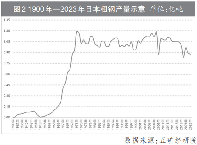 自二戰(zhàn)結(jié)束至1973年,日本僅用了28年時間就實現(xiàn)粗鋼產(chǎn)量登頂峰值。在此之后,日本鋼鐵工業(yè)在石油危機、廣場協(xié)議、金融危機、內(nèi)需下降、經(jīng)濟下行等多種因素的干擾下,依然保持在9000萬噸以上的峰值區(qū)間,至今已50余年,未來仍有較大概率在峰值區(qū)間震蕩運行。