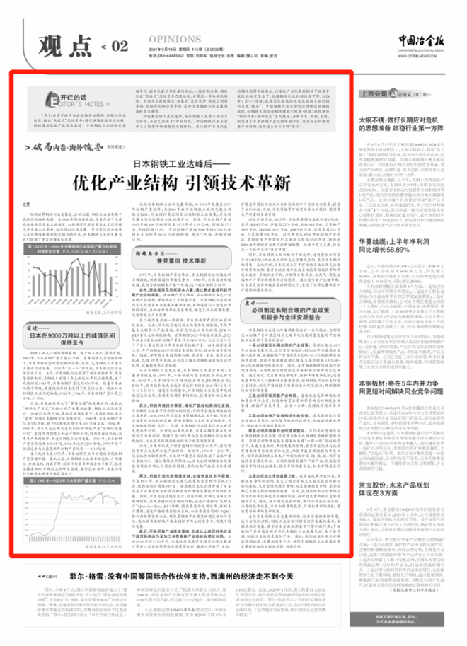 總結(jié)日本鋼鐵工業(yè)發(fā)展的經(jīng)驗,結(jié)合當(dāng)前的國際形勢,我們必須認識到:鋼鐵工業(yè)是任何國家經(jīng)濟發(fā)展的基石,在國家經(jīng)濟發(fā)展、國家安全方面發(fā)揮著不可替代的作用;中國粗鋼產(chǎn)量峰值區(qū)間并不代表鋼鐵行業(yè)發(fā)展見頂,至少在中國,鋼鐵工業(yè)依然是朝陽產(chǎn)業(yè)。因此,我們必須合理應(yīng)對峰值區(qū)間挑戰(zhàn),發(fā)展新質(zhì)生產(chǎn)力,保障中國鋼鐵工業(yè)在高質(zhì)量發(fā)展的新征程上由大轉(zhuǎn)強、由強轉(zhuǎn)優(yōu)。(左更)