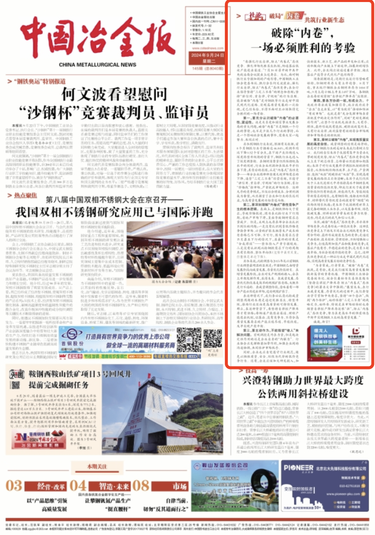 “要強化行業自律,防止‘內卷式’惡性競爭。強化市場優勝劣汰機制,暢通落后低效產能退出渠道?!?月30日召開的中共中央政治局會議提出上述要求。為此,面對鋼鐵行業虧損加劇的嚴峻形勢,中國鋼鐵工業協會黨委書記、執行會長何文波提出,強化行業自律,防止“內卷式”惡性競爭;在全行業倡導堅持“三定三不要”的理念和原則;堅持“講信用、重自律、守規矩”的行為準則。能否破除“內卷”是對鋼鐵等行業走好中國式現代化道路、實現高質量發展的一次檢視,是已經來臨、不得不面對且必須取得完全勝利的一場考驗。