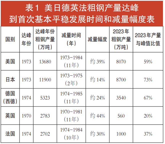 美國、日本、法國、德國、英國等發達國家的粗鋼產量集中在20世紀70年代達到峰值,并開始減量調整。這一趨勢由第一次石油危機引發,疊加發達國家工業化和城鎮化后期面臨經濟轉型和產業結構調整問題,鋼鐵需求下降造成了供需失衡。