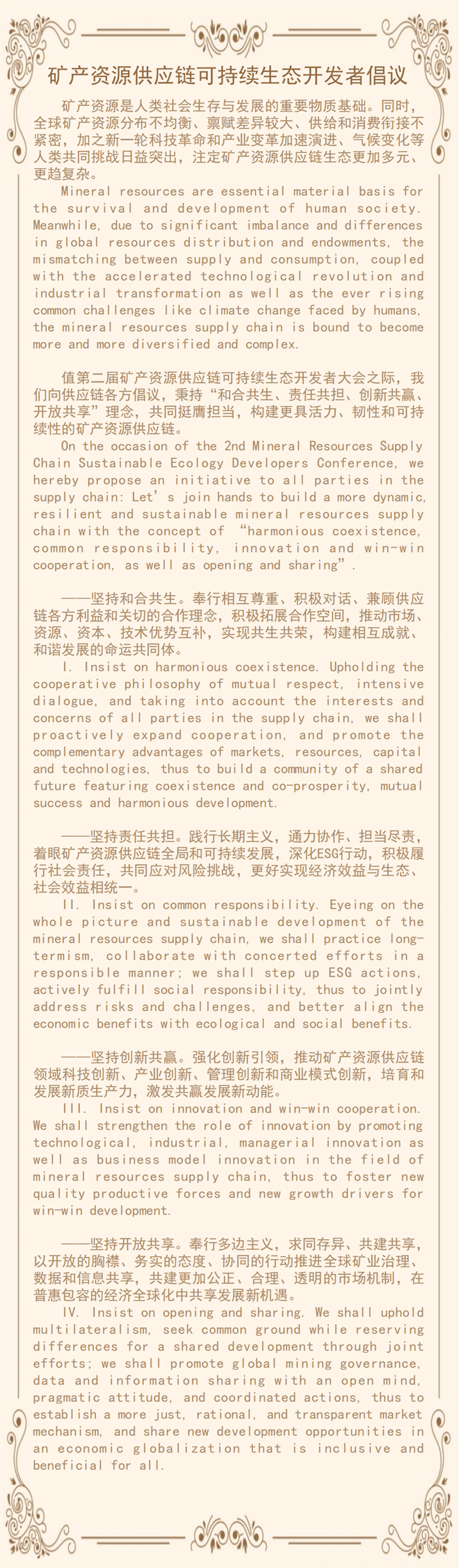 11月7日,在第二屆礦產(chǎn)資源供應(yīng)鏈可持續(xù)生態(tài)開發(fā)者大會(huì)上,中國礦產(chǎn)資源集團(tuán)、中國鋼鐵工業(yè)協(xié)會(huì)共同發(fā)布《礦產(chǎn)資源供應(yīng)鏈可持續(xù)生態(tài)開發(fā)者倡議》。