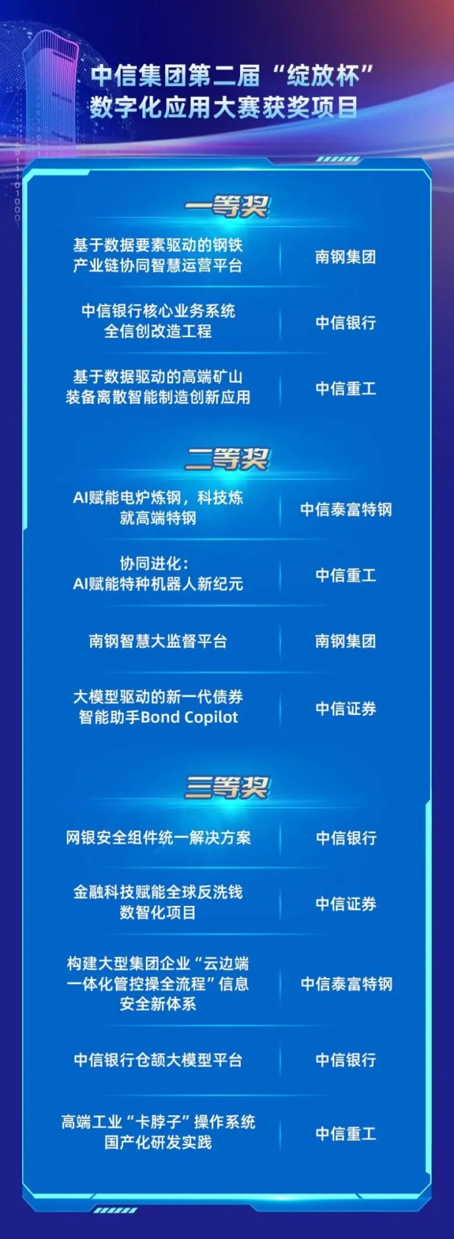 11月29日,中信集團成功舉辦第二屆“綻放杯”數字化應用大賽總決賽。本屆大賽分設“人工智能+”“數據要素×”“安全信創”三個賽道,共有134個項目參賽,應用案例覆蓋綜合金融服務、先進智造、先進材料、新消費、新型城鎮化等多個領域,經過層層選拔最終決出12個獲獎項目。其中,中信泰富特鋼《構建大型集團企業“云邊端一體化管控操全流程”信息安全新體系》、中信重工《高端工業“卡脖子”操作系統國產化研發實踐》獲得三等獎,中信泰富特鋼《Al賦能電爐煉鋼,科技煉就高端特鋼》、中信重工《協同進化:Al賦能特種機器人新紀元》、南鋼集團《南鋼智慧大監督平臺》獲得二等獎,南鋼集團《基于數據要素驅動的鋼鐵產業鏈協同智慧運營平臺》、中信重工《基于數據驅動的高端礦山裝備離散智能制造創新應用》獲得一等獎。