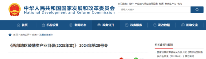 近日,國家發展改革委修訂出臺《西部地區鼓勵類產業目錄(2025年本)》。