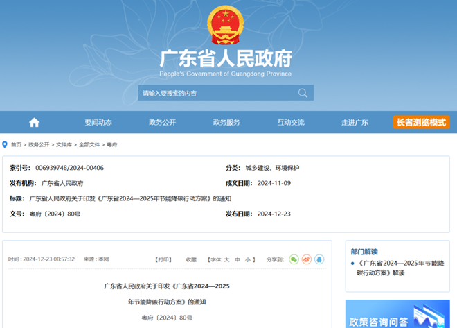 12月23日,廣東省人民政府網站發布了關于印發《廣東省2024—2025年節能降碳行動方案》的通知(以下簡稱《通知》)。