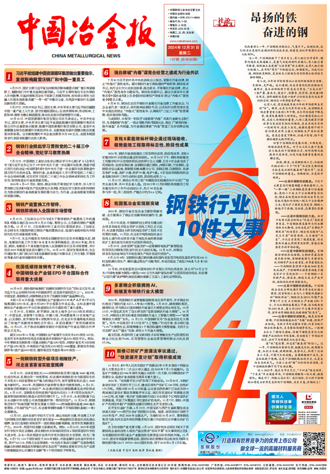 12月3日,由河北省科學技術廳主導,唐山市政府主建,華北理工大學與河鋼集團共建的河北省首家省實驗室——燕趙鋼鐵實驗室在河北唐山揭牌,旨在打造鋼鐵領域世界一流的原始創新策源地,培育和發展新質生產力。2024年,我國科技創新又添新成果。例如, 6月24日,2023年度國家科學技術獎在京揭曉,涉及鋼鐵相關領域的項目有4項獲得國家科學技術進步獎,各有1項獲得國家自然科學獎和國家技術發明獎,均為二等獎。8月7日, 110個項目被授予2024年鋼協、中國金屬學會冶金科學技術獎,其中“MCCR多模式全連續鑄軋一體化技術集成與創新”“信息物理系統融合的鋼鐵制造流程智能化研發及應用”“南鋼全要素數字化生產運營與智能制造核心關鍵技術創新”等3個項目被授予特等獎。