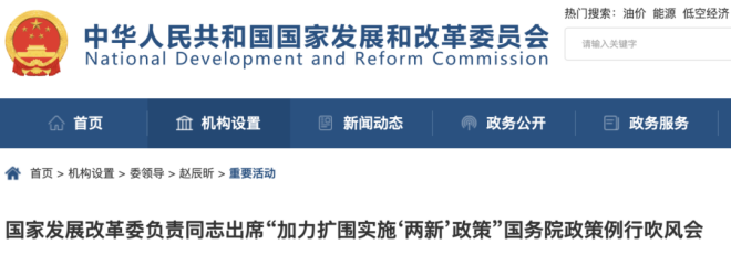 近日,國新辦舉行國務院政策例行吹風會。國家發展改革委副主任趙辰昕,國家發展改革委資源節約和環境保護司司長劉德春等出席發布會,介紹加力擴圍實施“兩新”政策有關情況,并答記者問。