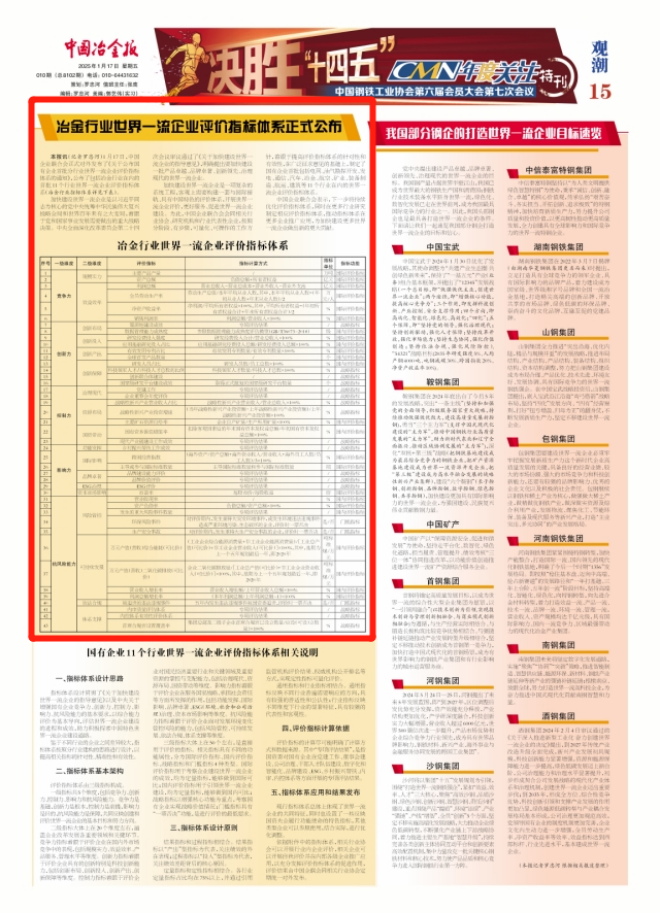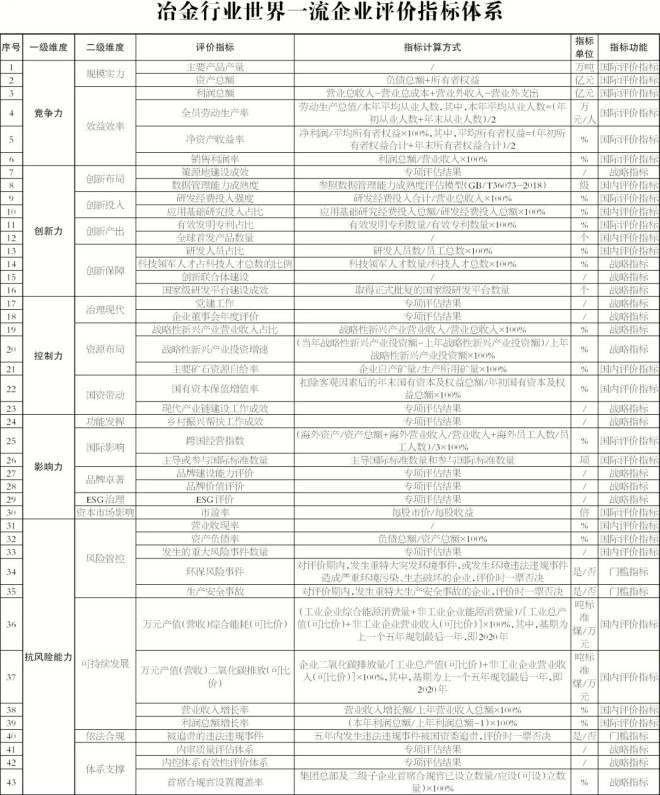 1月17日,中國企業聯合會正式對外發布了《關于公布國有企業首批分行業世界一流企業評價指標體系的通知》,公布了包括冶金行業在內的首批11個行業世界一流企業評價指標體系(冶金行業指標體系詳見下表)。