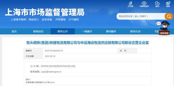 近日,上海市市場監督管理局對《包頭鋼鐵(集團)鐵捷物流有限公司與中遠海運物流供應鏈有限公司新設合營企業案》進行了公示。