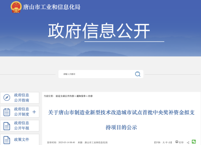 近日,唐山市工業(yè)和信息化局發(fā)布《關(guān)于唐山市制造業(yè)新型技術(shù)改造城市試點首批中央獎補資金擬支持項目的公示》。