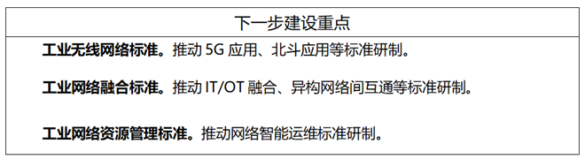 工業無線網絡標準主要包括無線局域網(WLAN)、無線可尋址遠程傳感器高速通道(WirelessHART)、用于工廠自動化/過程自動化的工業無線網絡(WIA-FA/PA)、窄帶物聯網(NB-IoT)、5G應用、北斗應用等標準。工業有線網絡標準主要包括現場總線、工業以太網、工業無源光纖網絡(xPON)、工業綜合布線、單對線以太網等標準。工業網絡融合標準主要包括確定性網絡(DetNet)、時間敏感網絡(TSN)、信息技術/運營技術(IT/OT)融合、異構網絡間互通、IPv6+、高可靠組網等標準。工業網絡資源管理標準主要包括網絡地址管理、網絡頻譜管理、網絡智能運維等標準。