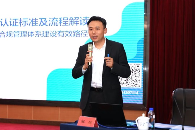 中國質量協(xié)會保證中心市場部部長兼ESG總監(jiān)解輝作了題為《國際合規(guī)體系認證標準及流程解讀》的專題授課。他從國際合規(guī)體系標準解讀到流程落地,從戰(zhàn)略布局到細節(jié)把控,通篇都貫穿在全球化浪潮中國際規(guī)則的普適性,為各企業(yè)建立健全國際合規(guī)體系提供了指南。