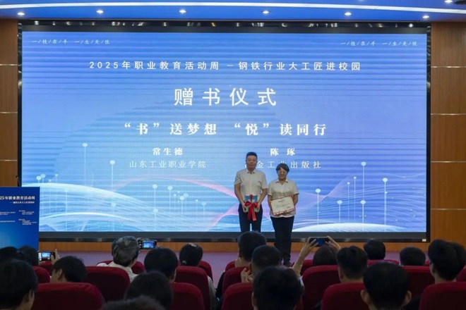 為深入推進全民閱讀,謳歌鋼鐵精神、講好鋼鐵故事、傳播鋼鐵聲音、展示鋼鐵形象、傳承鋼鐵文化,培養鋼鐵學子書香氣質,活動現場舉行了“書”送夢想 “悅”讀同行贈書儀式,由冶金工業出版社向山東工業職業學院贈送精品教材、專著等圖書。