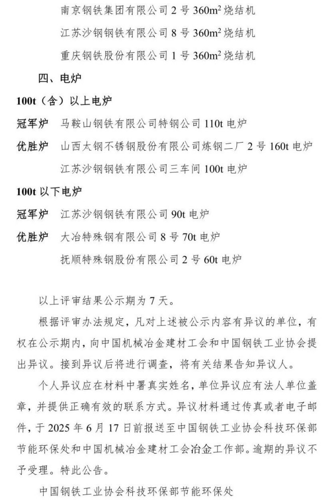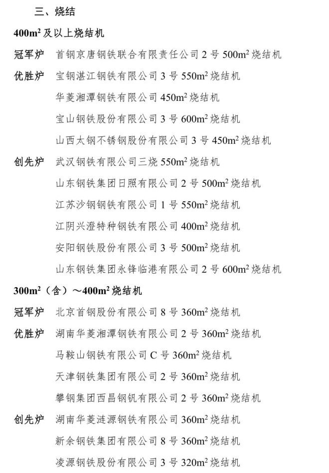 6月11日,中國鋼鐵工業協會發布全國重點大型鋼鐵生產設備節能降耗對標競賽評審結果公示。依據競賽活動方案評比辦法,經競賽專家組評審打分,提出冠軍爐、優勝爐和創先爐公示名單如下: