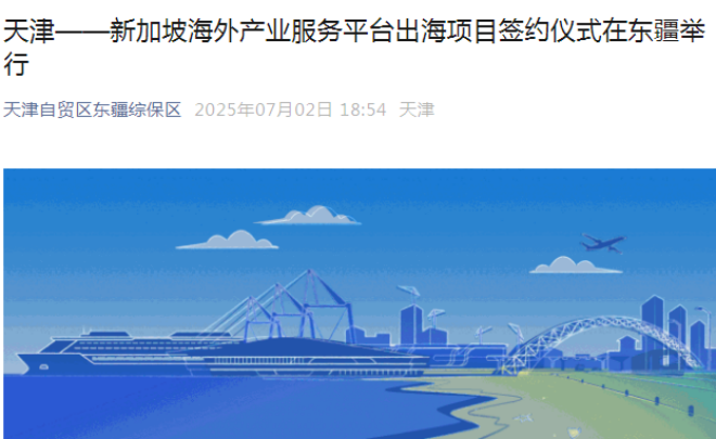 7月2日,天津自貿(mào)區(qū)東疆綜保區(qū)發(fā)布文章,報道了同日于東疆舉行的新加坡海外產(chǎn)業(yè)服務(wù)平臺出海項目簽約儀式。