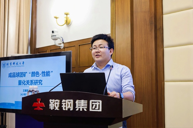 圖為北京科技大學副教授王耀祖作《成品球團礦“顏色-性能”量化關系研究》主題報告