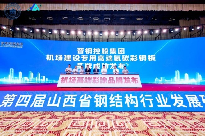 圖為晉鋼控股集團(tuán)機(jī)場(chǎng)建設(shè)專用高端氟碳彩涂板品牌發(fā)布現(xiàn)場(chǎng)