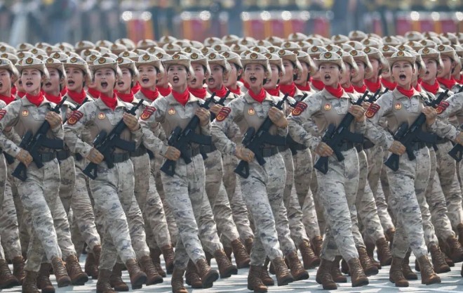 民兵方隊(duì)英姿颯爽,受閱女民兵來(lái)自當(dāng)年全國(guó)主要抗日根據(jù)地。